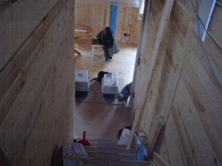 Blick die Treppe hinunter auf die Kennel. Smilla kontrolliert ob die noch vertraut riechen.