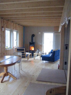 Noch etwas kahl, aber bereits sehr gemütlich mit all dem Holz und dem Feuer....