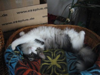 In diesem Korb liegen sonst bequem zwei Katzen. Pelle paßt ganz allein hinein....