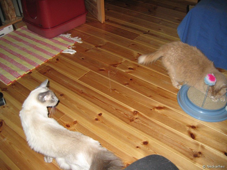 Schlechte Bildqualität, dafür beide Katzen drauf. Beide scheinen zu denken: "ich würd ja gern, aber ich trau mich nicht..."