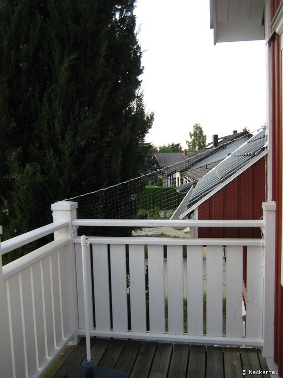 Der Abstand zwischen unterer und oberer Brüstung ist schmal genug, daß keien Katze wirklich durchpaßt. Aber durchgucken kann man gut.