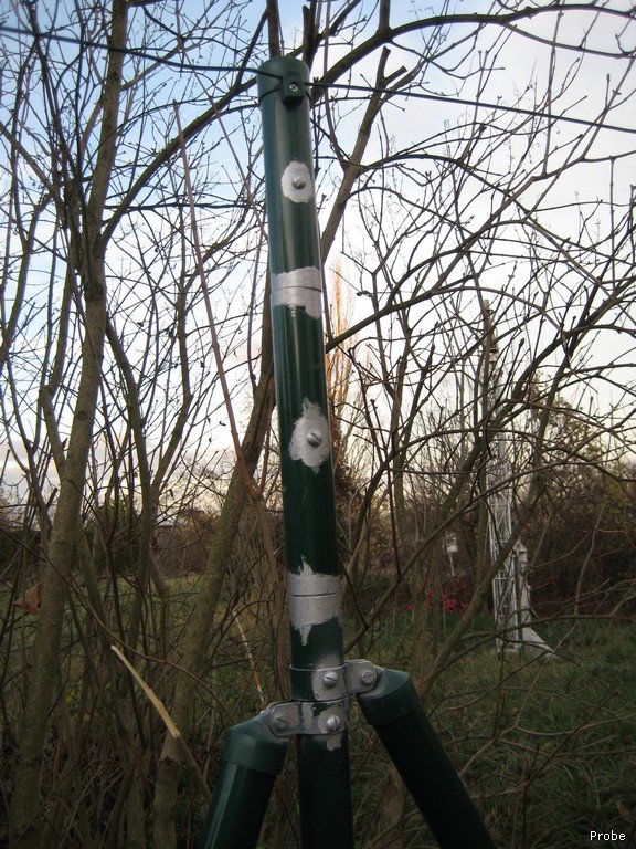 Detail Eckpfosten. Am Pfosten selbst zwei jeweils runde Schellen, die mit (mitgelieferten) Schrauben am Pfosten befestigt werden. Die ebenfalls mitgelieferten Schraubhaken halten dann die dünnen Zaunhalterstangen, wie hier zu erkennen ist. Eine weitere Aussparung befestigt dann die Drahtspanner (die länglichen Teile), für die wir die Schrauben allerdings noch kaufen mußten. Da wir das erst gemerkt haben, als wir loslegen wollten, mußte also erstmal einer zum Baumarkt. Die im Internet zu findenden Montageanleitungen waren alle relativ unspezifisch, was auch später noch ungeplante Baumarktfahrten bedeutet hat. Wir haben auch für die ergänzenden Schrauben Edelstahlschrauben und Ny-Stop-Muttern verwendet, um später jederzeit wieder aufschrauben zu können im Reparaturfall.