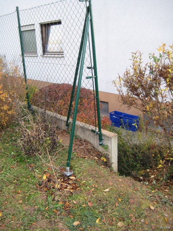 Querstück nach vorne rechts vom Haus: zwischen den Pfosten wird sich später das erste Tor befinden. Die Schrägstreben sind Restholz vom Bau, die ebenfalls einbetoniert wurden. Sie werden sich später außerhalb vom Zaun befinden, um keine Aufstieghilfe zu geben.