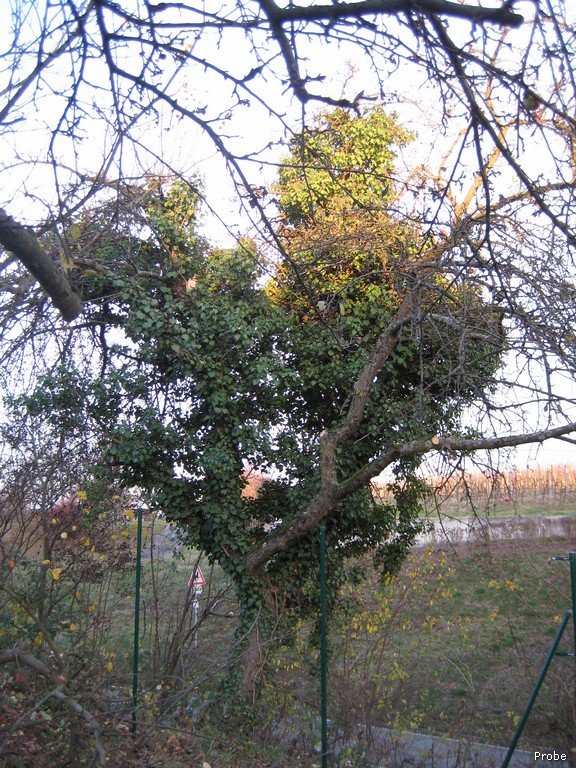 Direkt hinter dem hinteren Gartentor steht bzw. stand eine wild aufgegangene Kirschpflaume mit sehr langen Dornen, von einer wilden Rose vollkommen durchwachsen. Diese muß leider weichen, um die Stützmauer sinnvoll weiterführen zu können, zudem soll an ihre Stelle eine Zwetschge oder ein anderer Obstbaum für uns. Achim hat gestern den Baum fast komplett zerlegt; hier auf dem Rasen liegt die Krone.