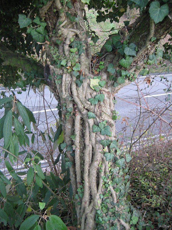 Der zweite Baum: ein Efeubaum. Vermutlich mal ein Apfelbaum, jeztzt nur noch Gerüst für einen unglaublichen Efeu. Alles was man hier grün sieht ist Efeu! Auch dieser Baum ist nicht mehr sehr gesund und neigt sich stark die Straße hinunter, weshalb auch er auf Dauer wegmuß - und ebenfalls durch Wild- oder Zuchtobst ersetzt wird.