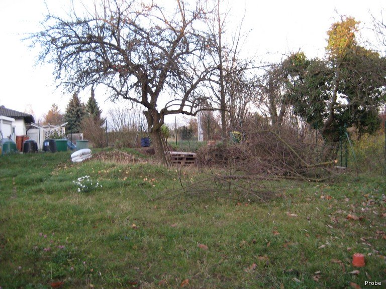 Der Rest vom Garten. Rechts am Bildrand der bereits erwähnte Eßkastanienbaum, dahinter der Apfelbaum und geradeaus Nachbars Garage an der Grundstücksgrenze.