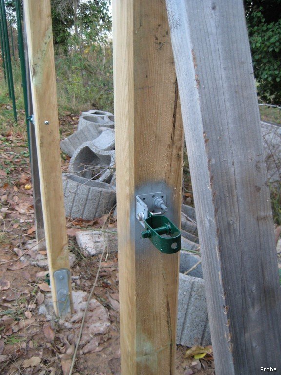 Detailaufnahme Befestigung Drahtspanner (grün) am Holzfposten. Eine lange Schraube, die durch den Holzbalken führt, hält einen Metallwinkel, an dem wiederum der Drahtspanner angeschraubt ist.