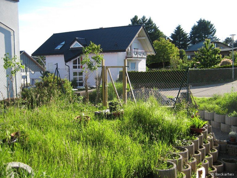 Blick über den Lichtgraben zum vorderen, rechten Zaun. Der Lichtgraben selbst ist mit Katzenschutznetz abgedichtet, da dort noch ein Tor hinkommt, sobald das Holzdeck über den Lichtgraben fertig ist.