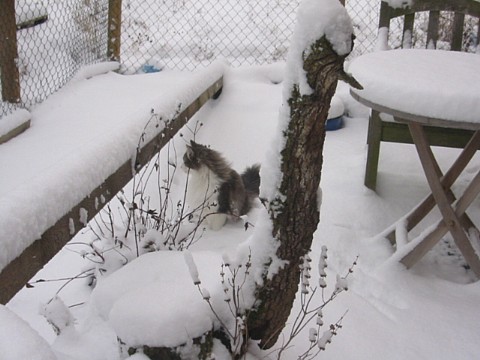 Kleiner wuscheliger Kater im tiefen Schnee.... Pelle im Schnee zu